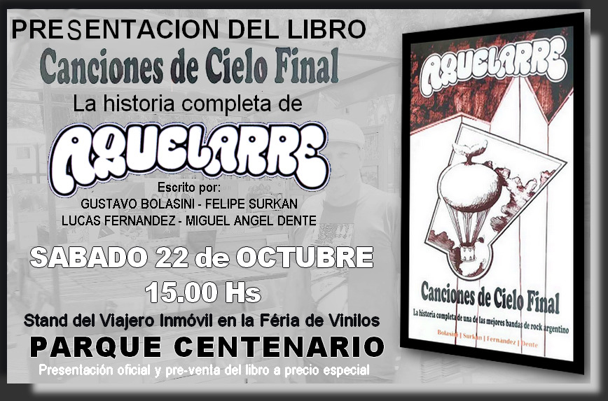 | En este documental de 10 minutos, te contamos como se hizo "Canciones de Libro Final" sobre la historia, música y legado de la banda Aquelarre, desde sus inicios como Rock Experimental y Del Guercio, García, Star, González Neira; su experiencia en España con la introducción del rock en español allí, su contexto histórico, social y musical, su desarrollo y su final, su reunión en 1998 continuando con su legado hasta nuestros días, el análisis de todo su música, la registrada y la inédita, de sus shows mas importantes, la visión de la prensa argentina y mundial, en época y hoy; para ello, entrevistamos a los cuatro músicos de la banda, allegados, asistentes, periodistas y colegas músicos; una historia como nunca se contó, a través de casi 300 páginas, con un material gráfico único y demás. Pasen y vean el "Making Off" de Aquelarre "Canciones de Cielo Final" escrito por Gustavo Bolasini, Felipe Surkan, Luca Fernández y Miguel Dente. Documental estrenado el Lunes 10/10/2020 - en nuestro canal de Youtube. (Link aquí) Lanzamiento del libro: 22 de Octubre de 2022