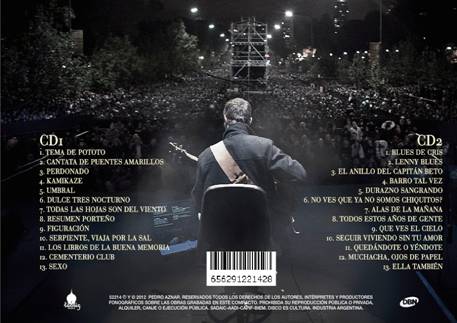 Repertorio: CD I: Tema de Pototo – Cantata de Puentes Amarillos – Perdonado – Kamikaze – Umbral – Dulce Tres Nocturno – Todas las Hojas son del Viento – Resumen Porteño – Figuración – Serpiente, Viaja por la Sal – Los Libros de la Buena Memoria – Cementerio Club – Sexo.