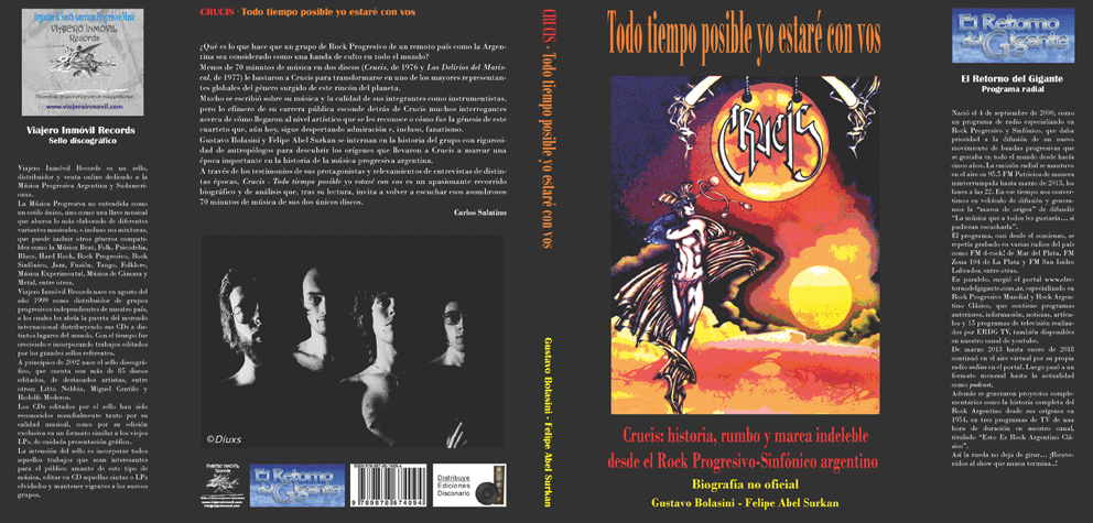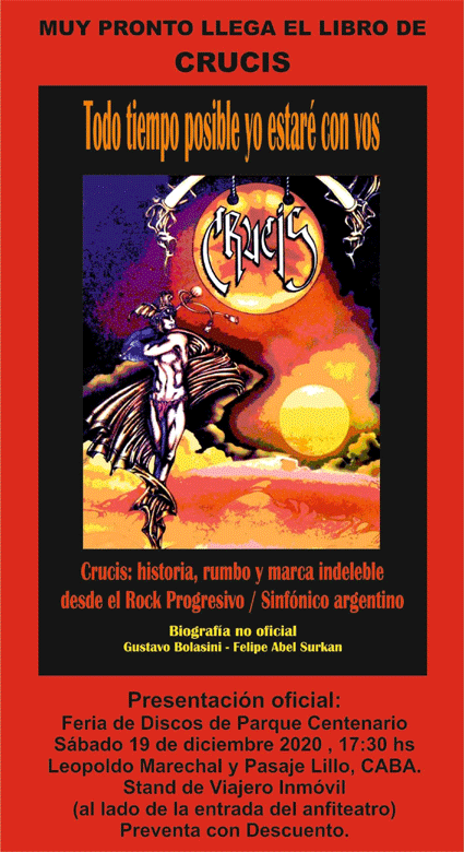 | En este documental de 15 minutos, te contamos como se hizo "El Libro" sobre la historia, música y legado de la banda Crucis, desde las bandas adolescentes de sus miembros, hasta llegar al nacimiento de Crucis, en su contexto histórico, social y musical, su desarrollo y su final, continuando con su legado hasta nuestros días, el análisis de todo su música, la registrada y la inédita, de sus shows mas importantes, la visión de la prensa argentina y mundial, en época y hoy; para ello, entrevistamos a casi todos los músicos que alguna vez pasaron por la banda, allegados, asistentes, periodistas y colegas músicos; una historia como nunca se contó, a través de casi 300 páginas, con un material gráfico único y demás. Pasen y vean el "Making Off" de Crucis "Todo Tiempo Posible Yo Estaré con Vos" escrito por Gustavo Bolasini y Felipe Surkan. Documental estreno el Viernes 04/12/20 - 21Hs en nuestro canal de Youtube. (Link aquí) Lanzamiento del libro: Diciembre de 2020